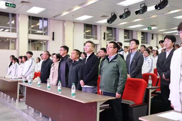 全体学员和嘉宾起立,共同奏唱团歌。激昂的旋律《光荣啊,中国共青团》在现场响起,“我们是五月的花海,用青春拥抱时代;我们是初升的太阳,用生命点燃未来!”