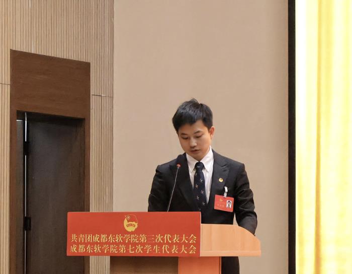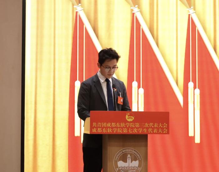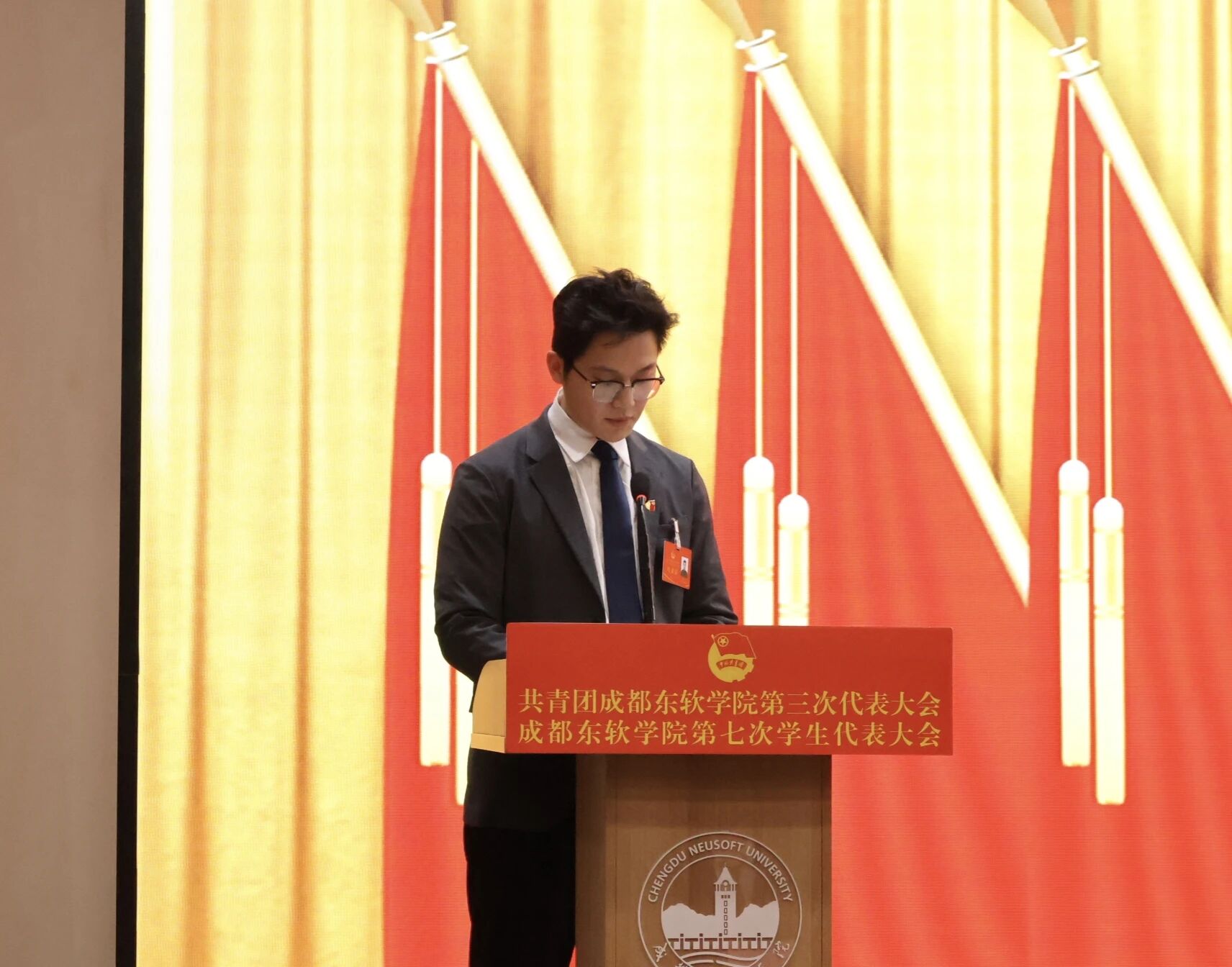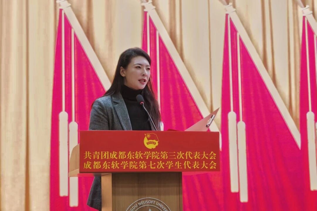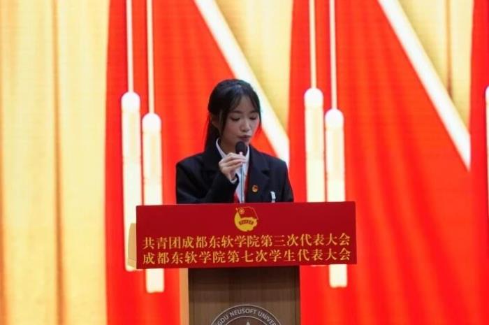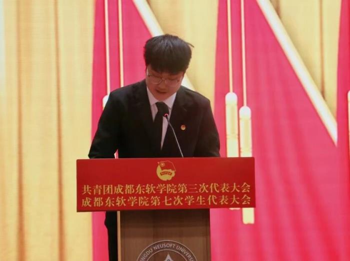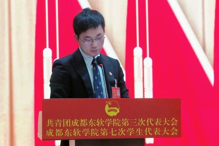 共青团成都市委副书记李路桥同志在讲话中代表团市委对大会的召开表示热烈祝贺,并高度评价了成都东软学院在应用型人才培养及共青团事业方面取得的显著成效,特别是学校在数字经济浪潮中引领青年在人工智能、软件开发等领域展现出的创新精神。他强调,学校团学组织要始终在校党委的领导下,聚焦为党育人的主责主业,将团的工作深度融入大思政育人格局,通过强化理论武装引领青年坚定不移听党话、跟党走。李路桥同志指出,要引领青年学子在科技创新、乡村振兴和社会服务等领域挺膺担当,紧扣成都建设青年发展型城市及十五五规划的发展契机,动员青年在社会实践与创新竞赛中提升综合素质。同时,他要求团组织切实发挥桥梁纽带作用,竭诚服务青年高质量发展,通过聚焦学业烦恼、就业实习及心理健康等急难愁盼问题,真正为学生办实事、解难事。最后,他号召全校团组织勇于自我革命,通过加强作风建设和落实党建带团建机制,塑造清澈阳光的组织形象,动员广大团员青年为学校早日建成有特色、高水平、创业型应用技术大学的目标贡献青春力量。