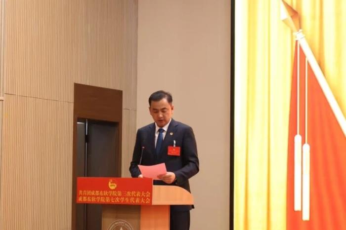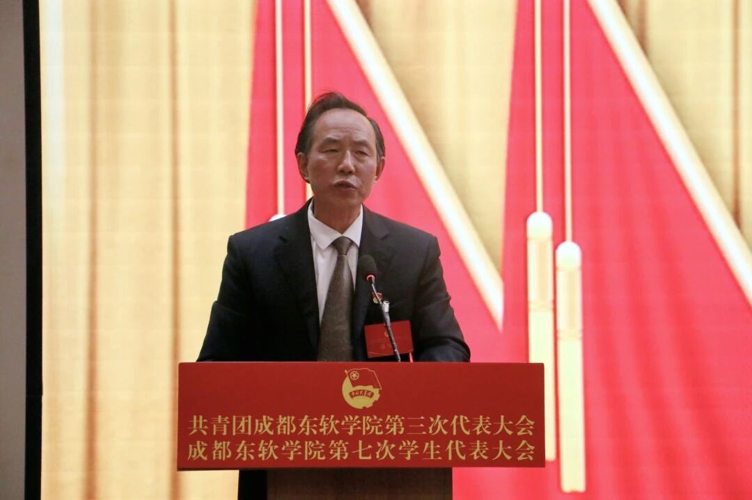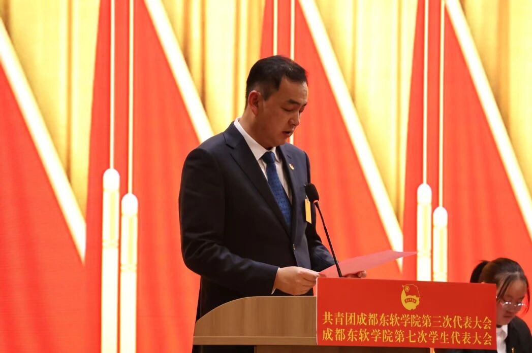 成都东软学院党委书记赖廷谦教授在讲话中强调,本次“双代会”是全校团员青年政治生活中的大事,是学校凝聚青年力量、共促事业发展的重要契机。他指出,学校党委始终坚持党建带团建,高度肯定了校团委作为党委得力助手在思想政治工作和人才培养中发挥的积极作用,并赞扬了东软学子在学科竞赛、社会实践及文明校园建设中展现出的责任与担当。针对新时代新征程,赖教授对全校团员青年提出了三点希望:首先要一把准政治方向,通过深入学习党的理论创新成果,将个人理想融入国家发展大局,做对党忠诚的奋斗者;二要立足专业实干,依托学校信息化、数字化的办学特色,钻研前沿技术,炼就过硬本领;三要扛起责任担当,积极参与志愿服务与社会实践,在服务大局中实现自身价值。同时,他要求团干部要牢记嘱托,做青年的贴心人而非“青年官”,切实解决学生的实际需求。最后,他呼吁学校各部门形成合力,落实党团一体化建设,为青年成长成才保驾护航,引领广大青年在民族复兴的生动实践中贡献青春智慧。